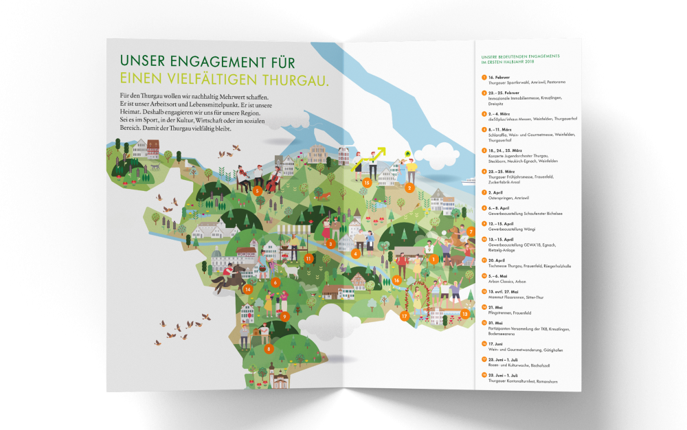 Im eigenen illustrativen Style wurden die Highlights möglichst originalgetreu nachempfunden und zur besseren Orientierung mit Nummern versehen. Der ganze Thurgau als Erlebnis-Plattform – von jung bis alt, von der Einzelperson bis zur Familie – alle Thurgauer:innen hatten so die Möglichkeit von einer grossen Vielfalt zu profitieren und sich durch die Erlebniskarte inspirieren zu lassen.